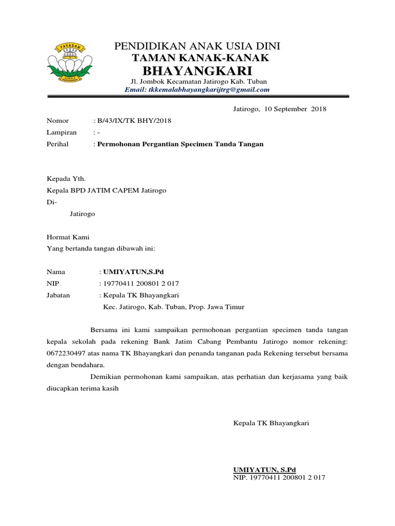 Surat permohonan pergantian kepala sekolah untuk bank jatim. Baiklah pemirsa blog tentangwebsites barang kali dari pemirsa ada seorang Kepala sekolah atau pimpinan sebuah perusahaanembaga atau yang lainnya dan pada saat ini menghadapi proses pergantian bendahara maka dari itu jika nama bendahara pada rekening bank akan di ganti tentu tanda tangan padarekening tersebut juga harus di ganti juga. Surat Permohonan Perubahan Specimen Rekening Bank. Surat kuasa pembukaan rekening yayasan.
