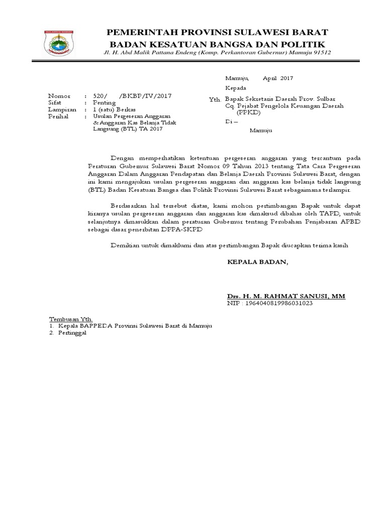 Surat permohonan pergeseran anggaran. 0180740690322013 Revisi ke 03 tanggal 25 September 2013 digital stamp 6389-0904- 9900-8003. IBNU RUSDI DJADI. Peraturan Menteri Keuangan Nomor.