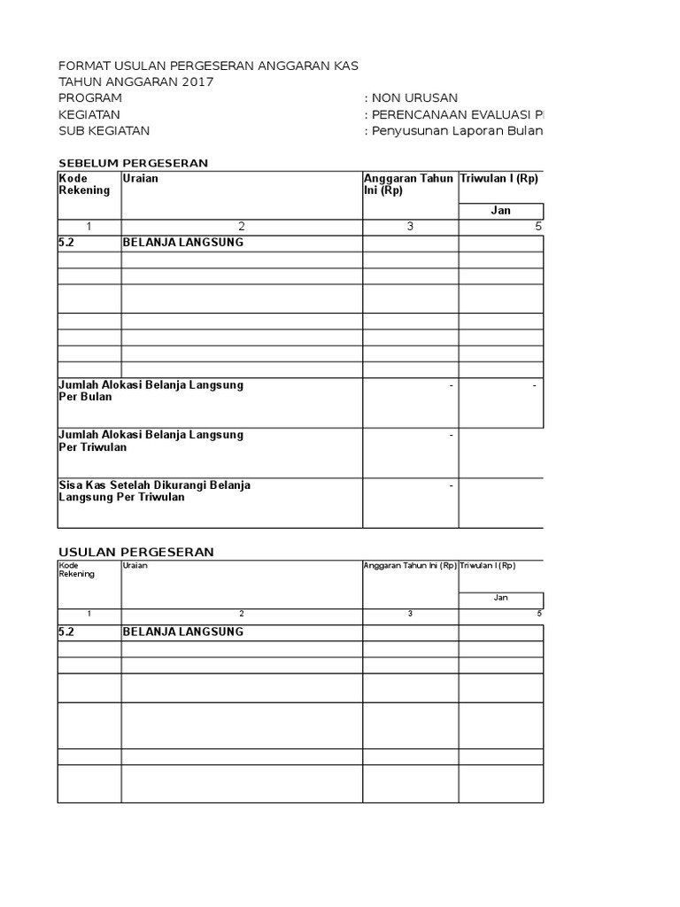 Bersama ini diusulkan Revisi Anggaran dengan rincian sebagai berikut. NON URUSAN KEGIATAN. SEBELUM PERGESERAN Kode Uraian Anggaran Tahun Triwulan I Rp Rekening Ini Rp Jan 1 2 3 5 52 BELANJA LANGSUNG.