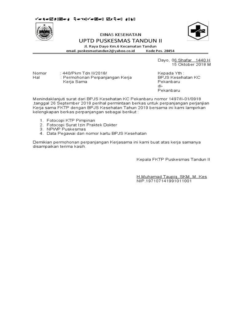 Permohonan Perpanjangan Kerja Sama Dengan Bpjs by ali_harahap_11 in Types Brochures permohonan perpanjangan kerja sama dengan bpjs. Dengan ini mengajukan permohonan perpanjangan kontrak kerjasama dengan bpjs cabang pekalongan yang akan berakhir tanggal 1 januari 2016 maka dengan ini saya mengajukan surat permohonan perpanjangan kontrak kerjasama selama 1 tahun terhitung dari tanggal habis kontrak. Perjanjian kerja sama klinikluarga dr afan spbu.