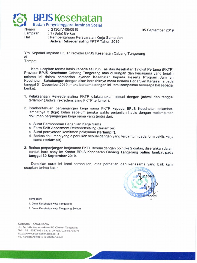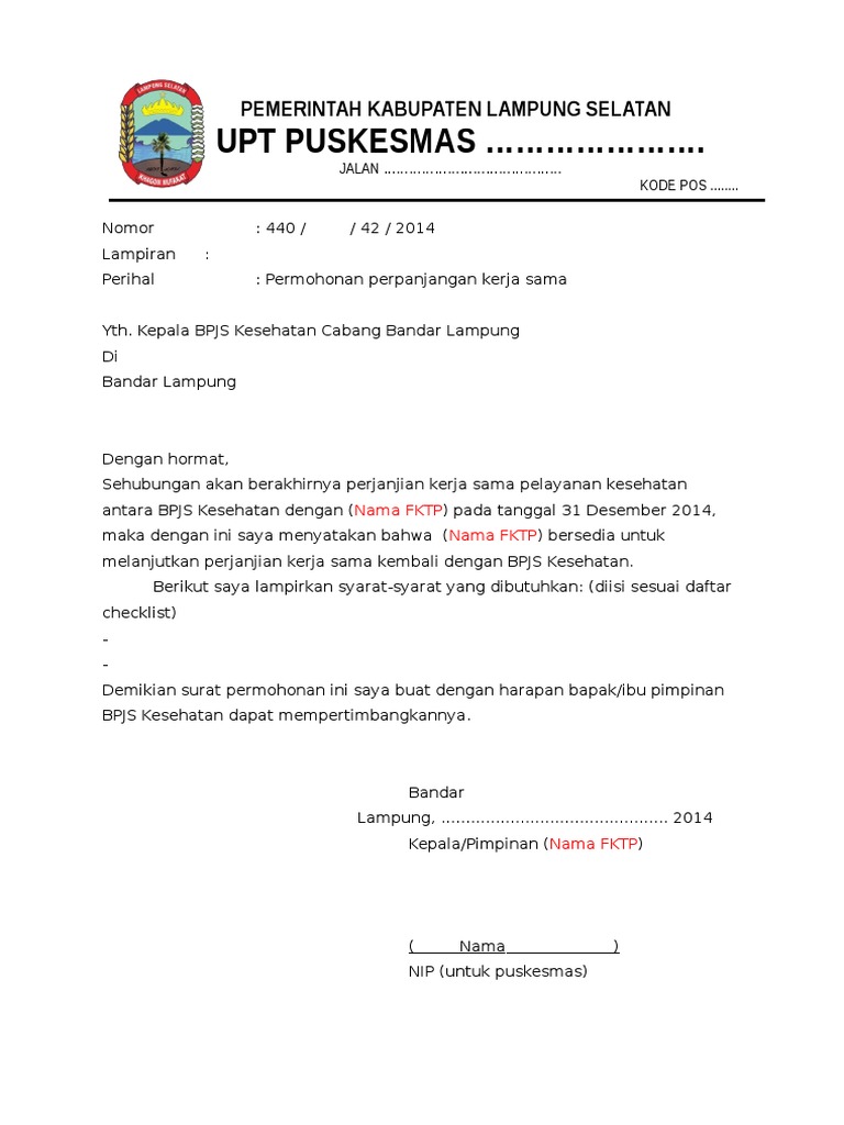 Surat permohonan perpanjangan kerjasama bpjs. 15 Contoh Surat Permohonan Kerjasama di Berbagai Bidang - Sebagai suatu perusahaan yang ingin maju dan berkembang maka tentu harus menjalin kerjasama dengan perusahaan lain maupun berbagai pihak lain. Dengan ini mengajukan permohonan perpanjangan kontrak kerjasama dengan BPJS Cabang Pekalongan yang akan berakhir tanggal 1 Januari 2016 maka dengan ini saya mengajukan surat permohonan perpanjangan kontrak kerjasama selama 1 tahun terhitung dari tanggal habis kontrak. Bagi Faskes tingkat pertama atau klinik atau dok ter yang ingin menjalin kerjasama de ngan BPJS Ke sehatan dan turut serta melayani pasien dalam program JKN Jaminan Ke sehatan Nasional ada be berapa hal yang perlu dipersiapkan.