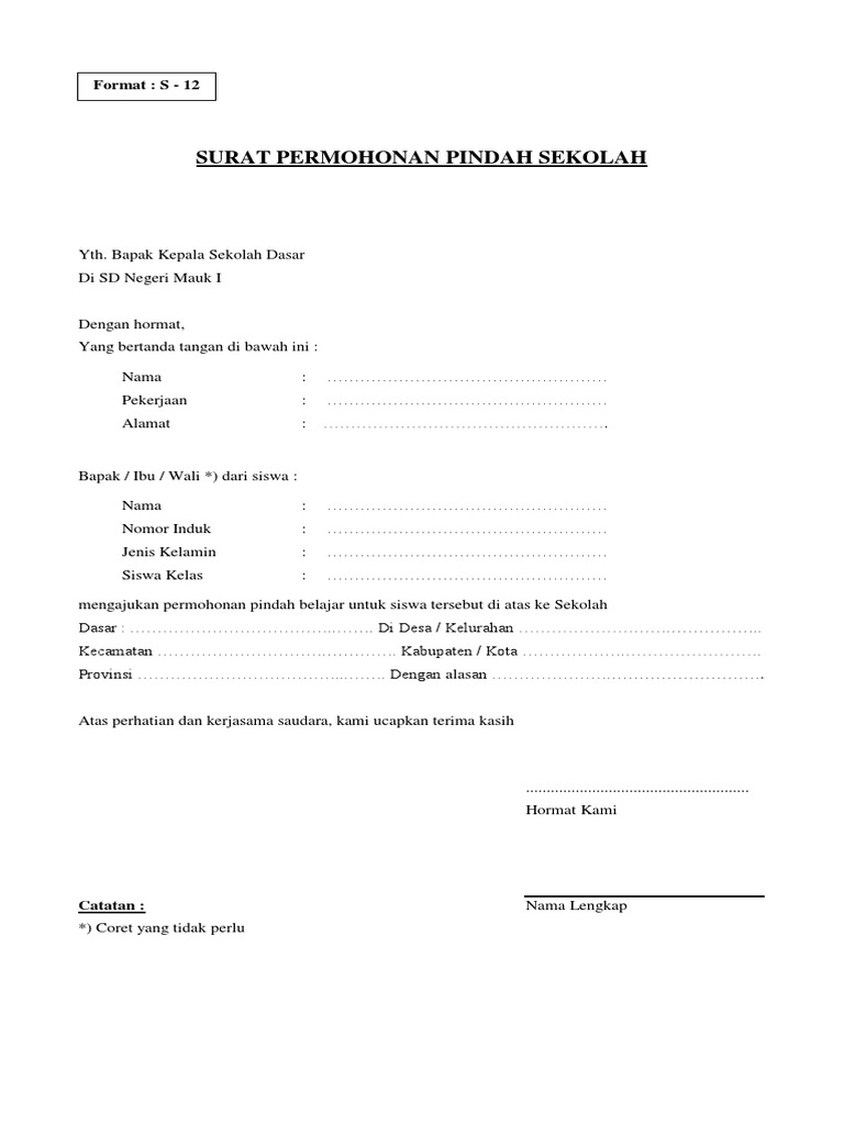 Surat permohonan pindah sekolah smp. Memang tidak ada ketentuan baku wacana format rujukan Surat Keterangan Pindah Sekolah Mutasi Siswa antar Madrasah. Sehingga apabila orang tua memiliki urusan dan kepentingan mendadak tidak perlu menunggu anak masuk ke jenjang Sekolah Dasar SD. Secara Online untuk jenjang SDMI SMPMTs SMA MA dan SMK bisa dilakukan dengan Aplikasi Pendataan Dapodikdasmen atau Kemenag.