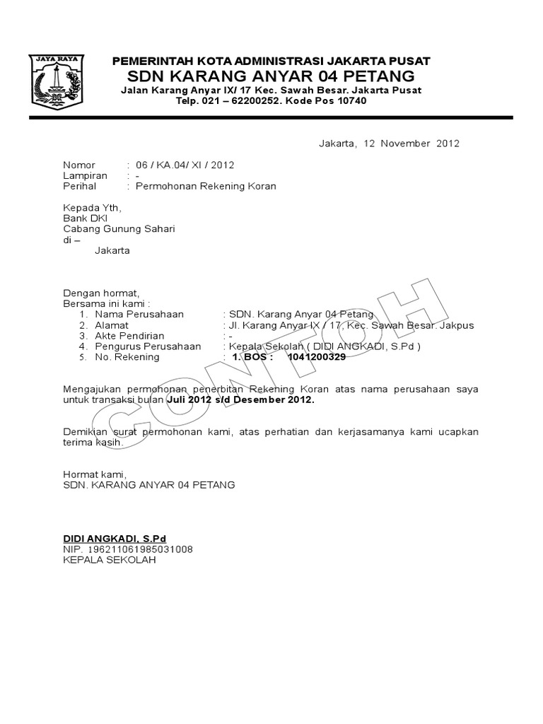 Surat permohonan rekening koran perusahaan. Proses pembukaan rekening tidak terlalu lama setelah rekening jadi anda langsung dapat menggunakannya hari itu juga. Fungsi rekening koran perusahaan ini ialah untuk melakukan rekap daftar keuangan baik transaksi arus masuk dan keluar. Waringin jaya rt 02 03 desa waringin jaya kec.