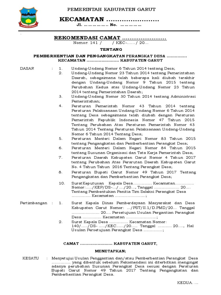 Bersama ini kami sampaikan dengan hormat bahwa berdasarkan Peraturan Menteri Dalam Negeri Nomor 83 Tahun 2015 tentang Pengangkatan dan Pemberhentian Perangkat Desa sebagaiamana telah diubah dengan Peraturan Menteri Dalam Negeri Nomor 67 Tahun 2017 tentang Perubahan atas Peraturan Menteri Dalam Negeri Nomor 83 Tahun 2015 tentang Pengangkatan dan Pemberhentian Perangkat Desa. Contoh Surat Permohonan Rekomendasi Camat tentang Pemberhentian Perangkat Desa Coba tebak ada berapa contoh surat permohonan rekomendasi Camat tentang Pemberhentian Perangkat Desa yang akan Kami berikan kepada Sobat Desa semua. Tidak tanggung tanggung dalam ulasan ini sobat desa akan menemukan 9 sembilan contoh format dokumennya yang dapat.