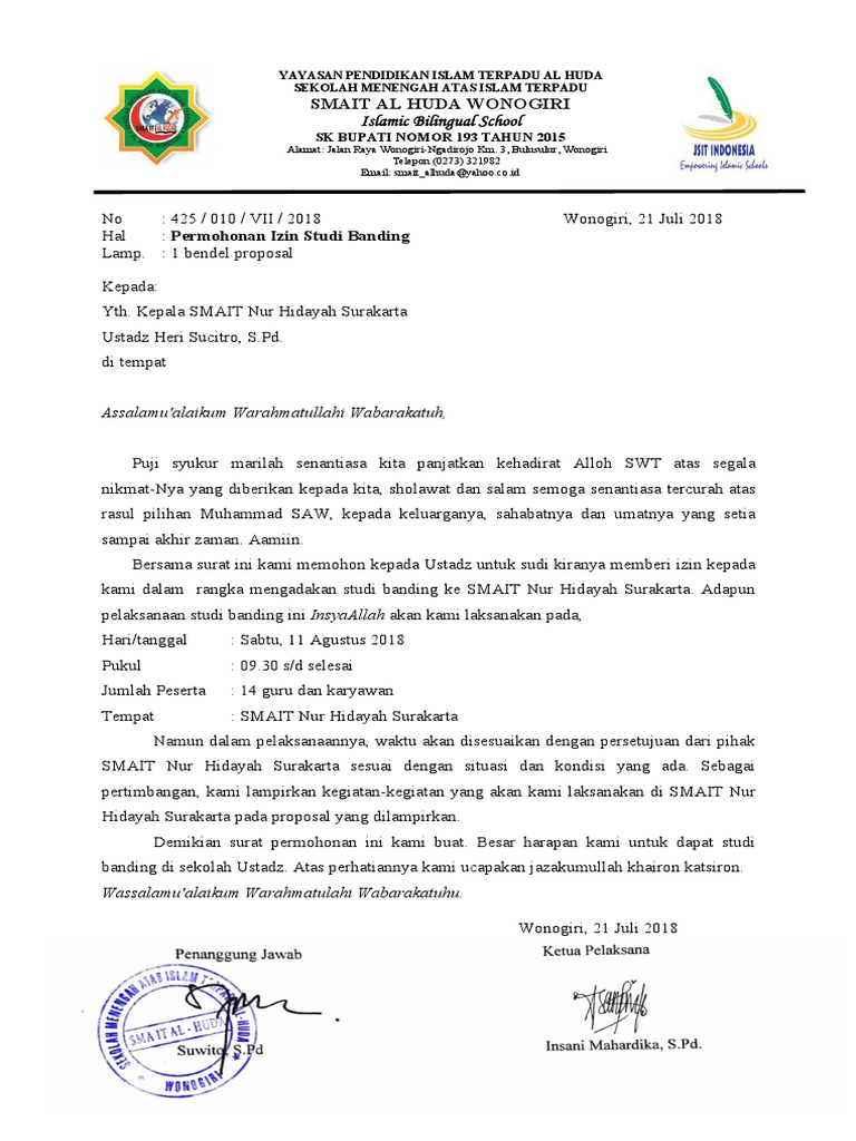 Surat permohonan studi banding sekolah. Bersama ini kami sertakan file proposal kegiatan studi banding ke pondok pesantren modern islam Assalam. Contoh Surat Pinjam Pakai Lahan Contoh Surat Pinjam Pakai Lahan - berikut saya tampilkan contoh surat permohonan pinjam pakai lahan untuk kepentingan umum. Contoh Surat Perintah Perjalanan Dinas Sppd.
