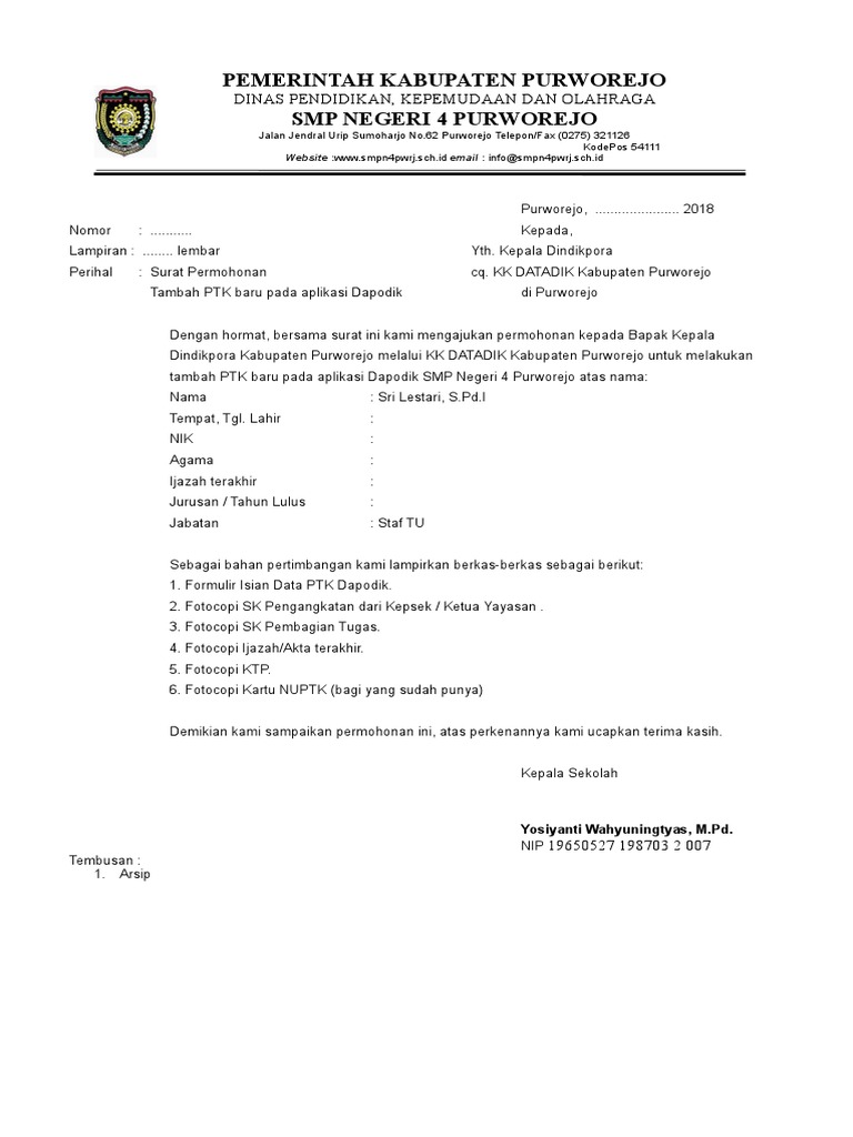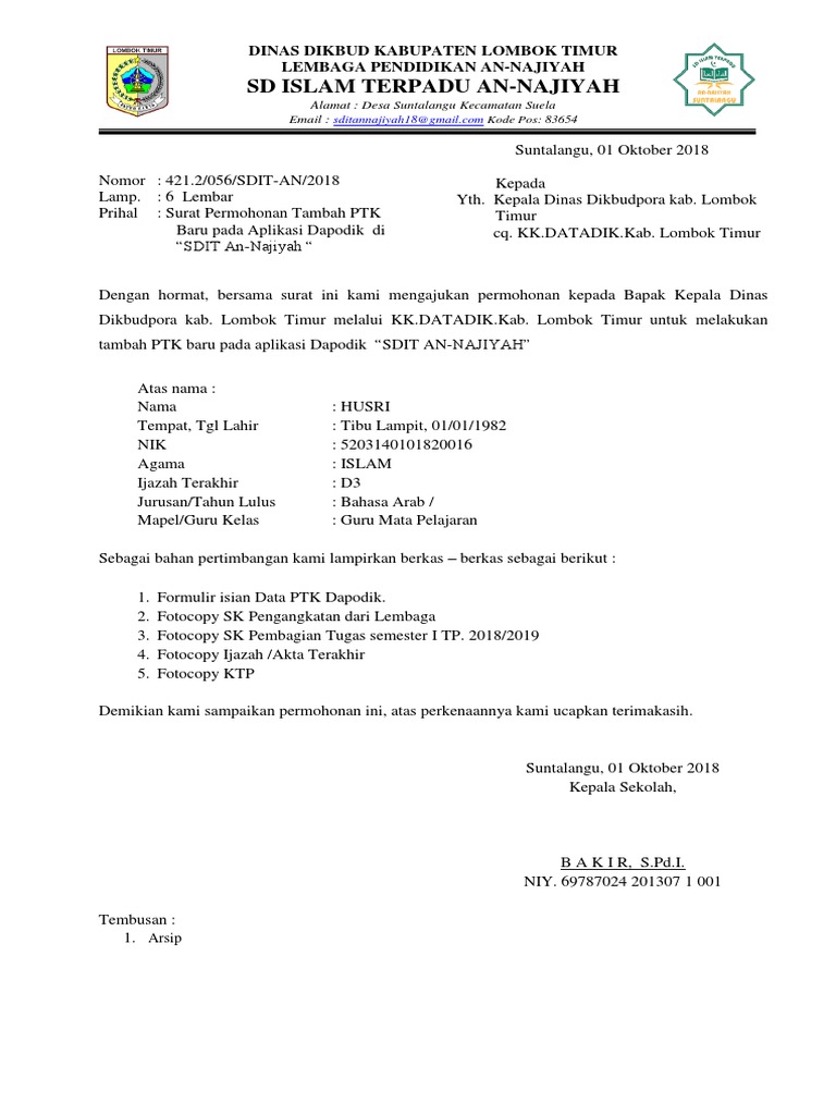Surat Permohonan Tambah Ptk Baru Dapodik 2018