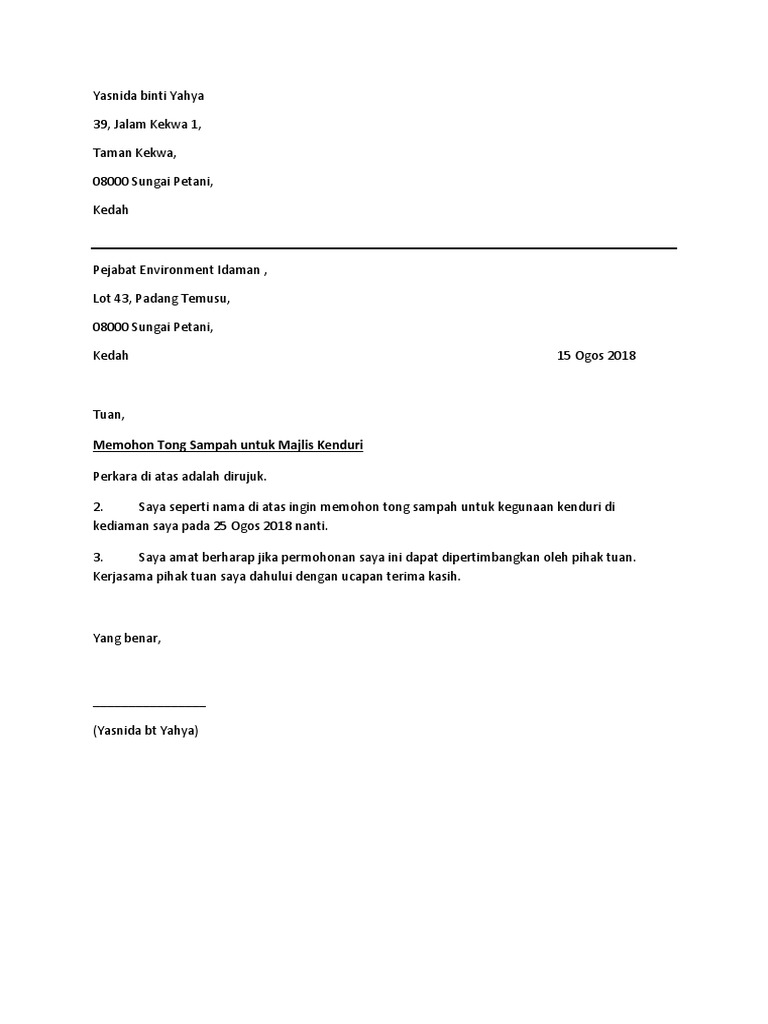 Surat permohonan tong sampah. Tongbak sampah yang sudah terisi sampah paling lama Pk. Kenapa kami tidak dapat sebarang memo atau notis. Related Posts To Contoh Surat Rasmi Permohonan Tong Sampah Contoh Surat Rasmi Permohonan Tong Sampah 2018-08-09T010400-0700 Rating.