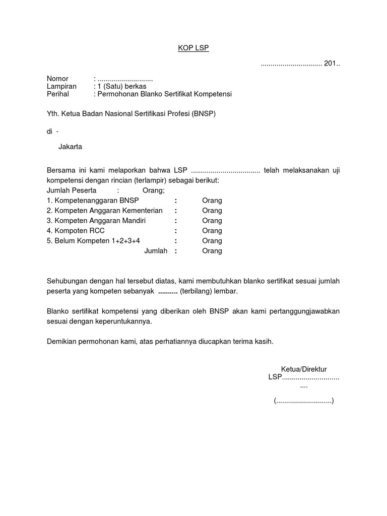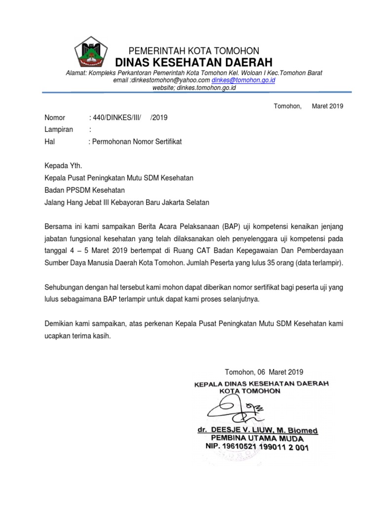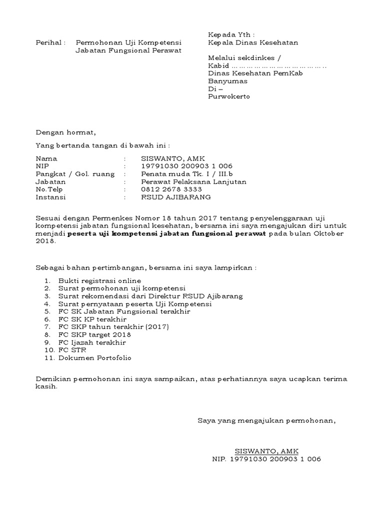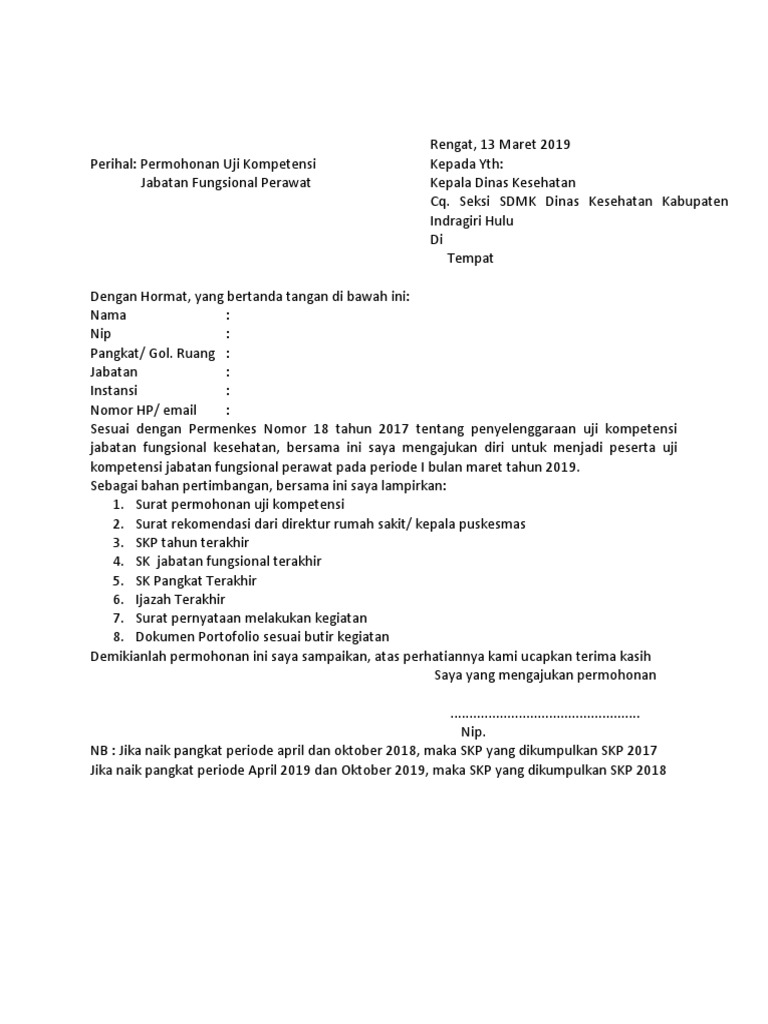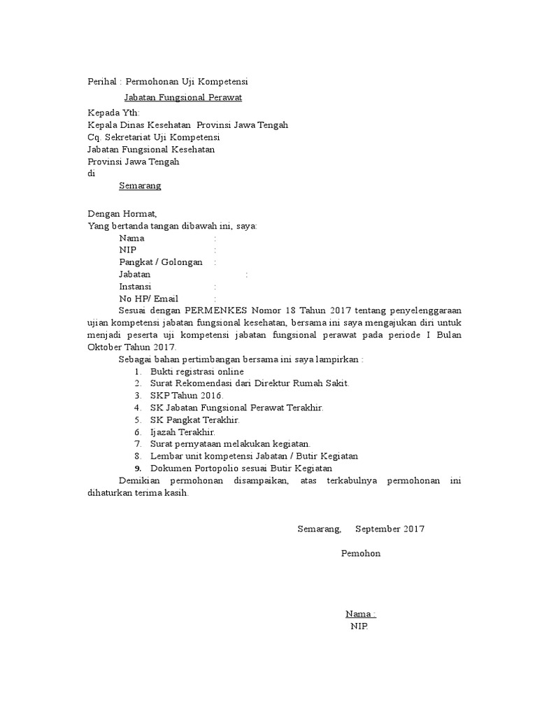Uji Kompetensi merupakan inovasi dalam uji kompetensi yang awalnya bersifat manual menjadi elektronik dengan tujuan meningkatkan efisiensi dan efektifitas proses uji kompetensi bagi pejabat fungsional kesehatanBerikut adalah link untuk mengakses sistem. Jumlah Peserta Nomor Surat Perihal Lampiran Kepada Alamat Tujuan Salam Pembuka Paragraf 1 Surat Pernyataan Uji Kompetensi. Twitter Share on whatsapp.