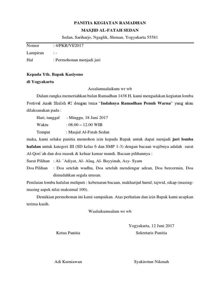The collection that consisting of chosen picture and the best among others. Bertemu lagi dengan Saya Husnul. Contoh surat permohonan menjadi juri lomba ini biasa digunakan untuk membuat surat permohonan juri pada beragam jenis lomba.
