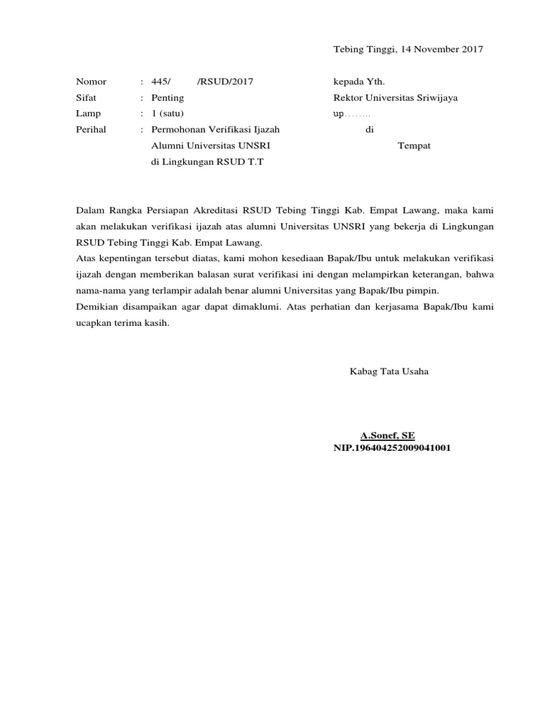Kania Tren Share to. Perhitungan waktu dimulai sejak surat permohonan pengkajian dinyatakan lengkap pada proses verifikasi berkas sampai dikeluarkannya surat jawaban. Contoh surat permohonan verifikasi ijazah untuk melaar cpns.