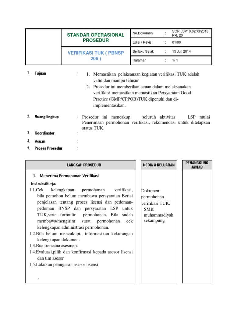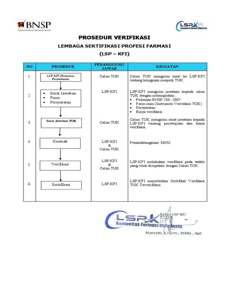 Menerima Permohonan Verifikasi Instruksi Kerja. Proses perpanjangan verifikasi serupa dengan proses awal verifikasi yaitu sesuai dengan uraian pada butir 51 sampai dengan 57 dengan mempertimbangkan pengalaman verifikasi sebelumnya. FR TUK SW 01 Formulir kesediaan menjadi Mitra dengan tembusan lampiran Susunan Panitia dan Kelengkapan Sarana dan Prasarana unduh Form Kesediaan menjadi Mitra LSP P-II KPK menunjuk tim Asesor Lisensi dokumen berupa.