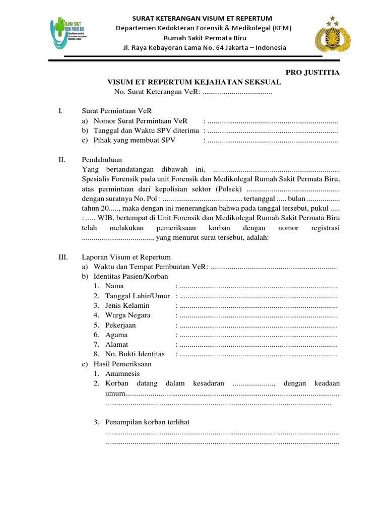 Sejatinya seluruh rumah sakit yang terbesar di Indonesia kecuali klinik memiliki tenaga medis yang sangat lengkap dan kompeten dalam menerbitkan surat keterangan semacam Visum Et Repertum. A short summary of this paper. Visum et repertum disingkat VeR adalah keterangan tertulis yang dibuat oleh dokter dalam ilmu kedokteran forensik Lihat.