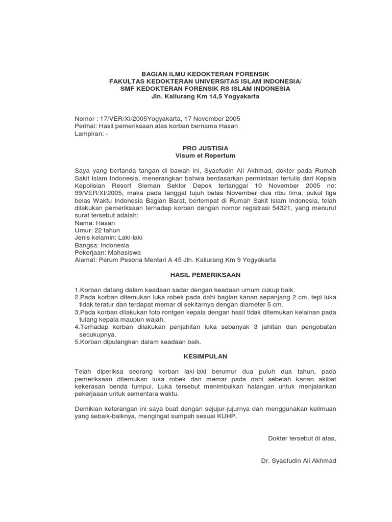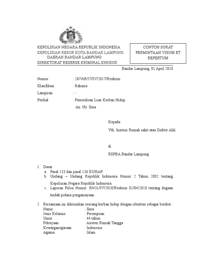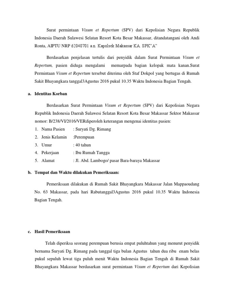 Contoh surat visum et repertum academia edu is a platform for academics to share research papers. Pelayanan Permohonan Visum 30 Menit terhitung dari pemohon memberikan permohonan kepada SPKT dengan syarat lengkap. Ditemukan jaringan parut dari bekas luka robek yang telah dilakukan penjahitan pada sisi luar tungkai bawah kiri.